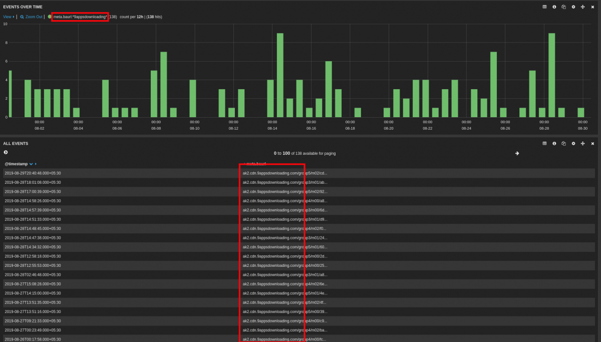 Further scrutiny of Zscaler cloud traffic showed multiple requests for APK downloads from this 9appsdownloading[.]com domain. Within the last month, we found 130+ such requests. The hits can be seen in the Zscaler cloud dashboard: