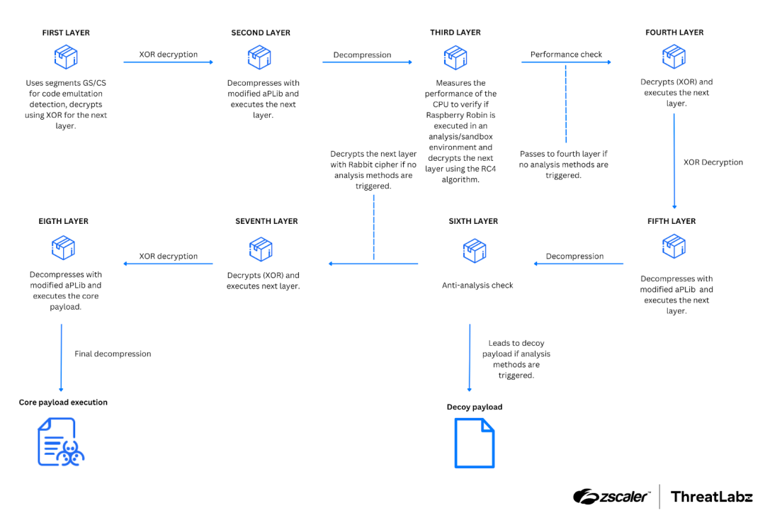 The sixth execution layer includes the majority of the anti-analysis techniques. Moreover, if an anti-analysis method is not passed in this layer successfully, then Raspberry Robin deploys a decoy payload.