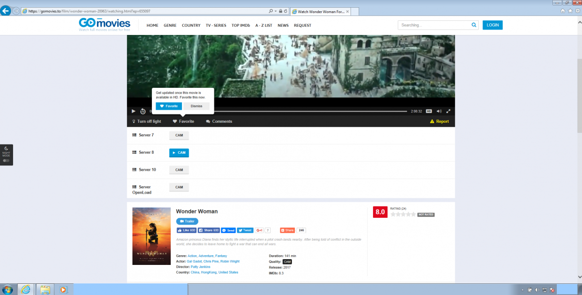 The streaming website has a collection of bootlegged copies of recently released movies. One such movie was Wonder Woman, and the site offered multiple links to audience-recorded (“cammed”) copies.