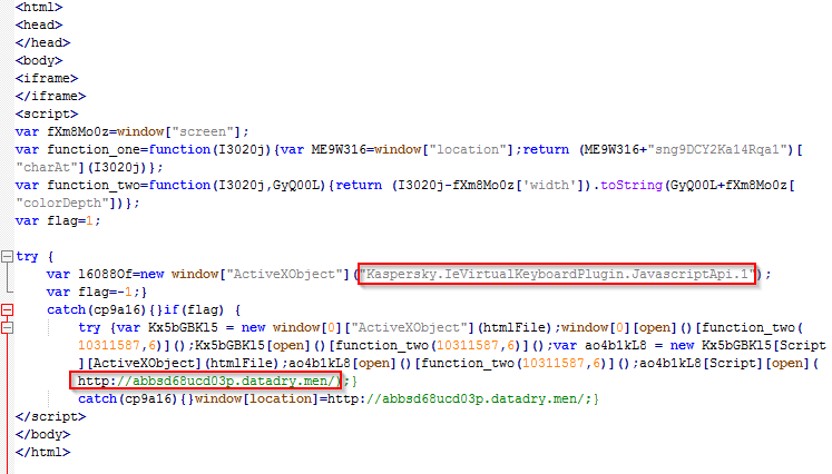 We see a check happening for a Kaspersky plugin, which if unsuccessful, will redirect the user to the landing page.