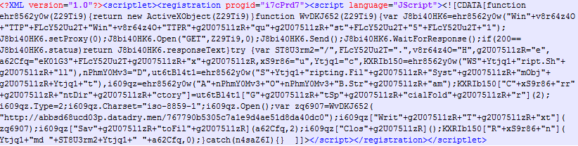 The simplified form of the scriptlet is shown below, and we can see the name of application being registered and the download URL for the base64 stream.
