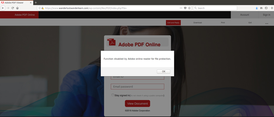 A simple anti-analysis technique used by scammers is disabling the right click functionality to prevent users from checking the page source. This can be seen in the phishing page below, which is pretending to be an Adobe Online document.