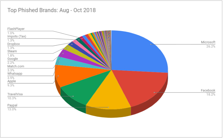 Microsoft tops the list partly because of Microsoft’s multiple enterprise web properties, such as OneDrive, Office 365, Outlook Web Access, among others, being targeted by the threat actors. Microsoft was followed by Facebook and PayPal in the list. In addition to the known brands, it was interesting to see phishing campaigns targeting Travel Visa portals (Canadian Visa and Australian Visa, for example) included in our top five most targeted brands. The attackers in this case were most likely interested in phishing for sensitive immigration information, such as passport details, date of birth and national identification numbers.