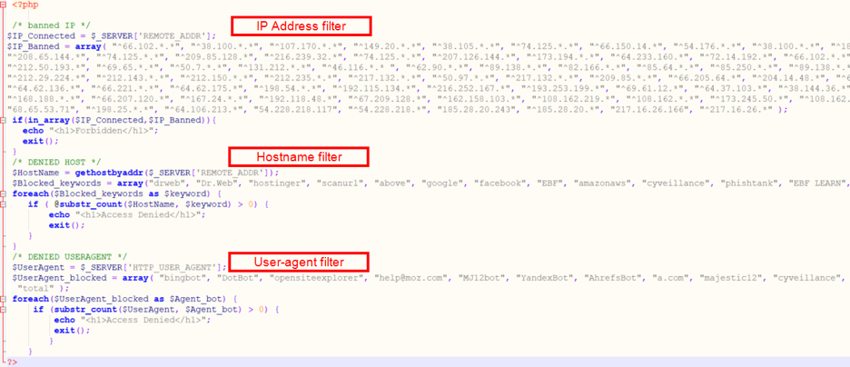 We’ve also observed malicious actors trying to fingerprint and serve phishing content based on the user’s IP address, host names, and user agents. We can see an example in the snippet below where the attacker is maintaining a list of IP addresses, hostnames and User-Agent strings known to be used by security researchers and analysts while attempting to get the phishing. If any request to the phishing site arrives from one of the known IP addresses or hostnames, or has one of the listed User-Agent strings then the phishing page will not be served. This tactic helps the attacker to keep the phishing page content undetected for a longer duration.