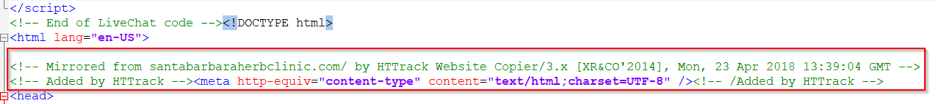 The scam websites even have live chat support, which responds to queries and guides users through the payment process. The photos of doctors were taken from a royalty-free stock photography database. When checking the source code in the Fig 11 example, we found that the contents were copied from a legitimate site, santabarbaraherbclinic[.]com, and we can see the timestamp in the screenshot below.