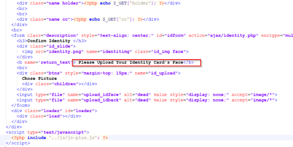 We have also seen multiple instances of phishing attacks that prompt users to verify their identity by asking them to upload a copy of their ID, as shown in the code below.
