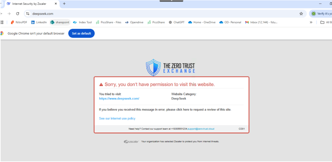 - Valide a implementação tentando acessar URLs do DeepSeek a partir de terminais com tráfego roteado pela Zscaler Zero Trust Exchange. As solicitações devem ser bloqueadas, acompanhadas de uma mensagem de notificação.