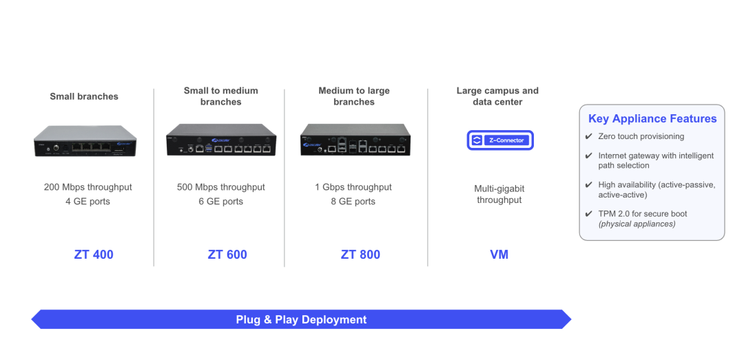 We are also pleased to announce general availability of our Z-Connector plug & play appliances — ZT 400, ZT 600 and ZT 800. Along with a lightweight virtual machine form factor, these appliances can support a wide range of customer requirements, ranging from 200 Mbps to multi-gigabit. With pre-provisioned config templates and zero touch provisioning, deploying a new branch can be as simple as plugging in an internet connection.