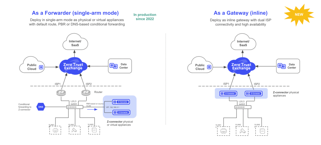The Zero Trust SD-WAN solution can be deployed in two modes: as a Forwarder, or as a Gateway. The Forwarder mode enables customers with existing WAN solutions to implement a zero trust overlay by deploying Z-connector appliances next to their existing routers and switches. Relevant traffic can be directed to the Z-connector appliances through conditional DNS resolution or policy-based routing.