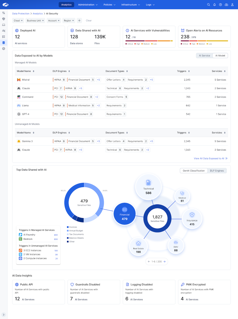 Simultaneously as AI models ingest and process colossal volumes of data distributed across multi-cloud environments, it leaves organizations vulnerable to data exfiltration, model theft and unauthorized access. Misconfigurations in AI services, overprivileged access granted to AI resources , and a lack of visibility into shadow AI instances become critical attack vectors. Securing AI – from data ingestion and model training to usability of these private AI and LLMs – demands deep, holistic visibility into your data and AI models that legacy, disjointed security tools simply cannot provide.