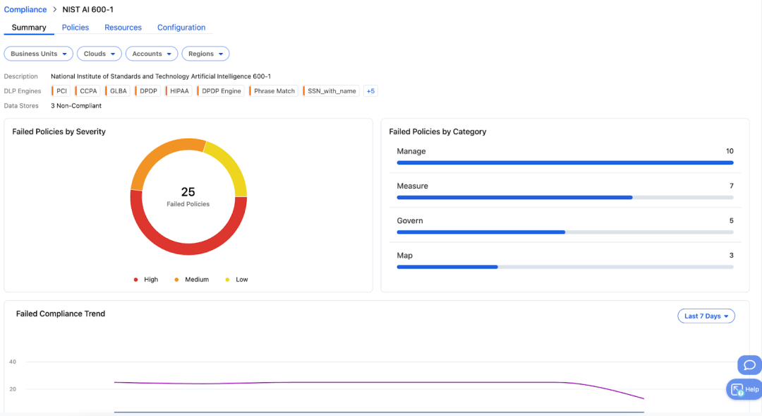In addition, Zscaler AI-SPM provides comprehensive visibility into AI and data compliance posture with a dynamic view of compliance status, configuration drifts, and policy violations. It also automatically benchmarks against regulations like GDPR or HIPAA as well as AI-specific standards like NIST AI RMF 600-1 and more through continuous monitoring and compliance reporting. This in-depth view into compliance will allow organizations to strengthen their AI governance.