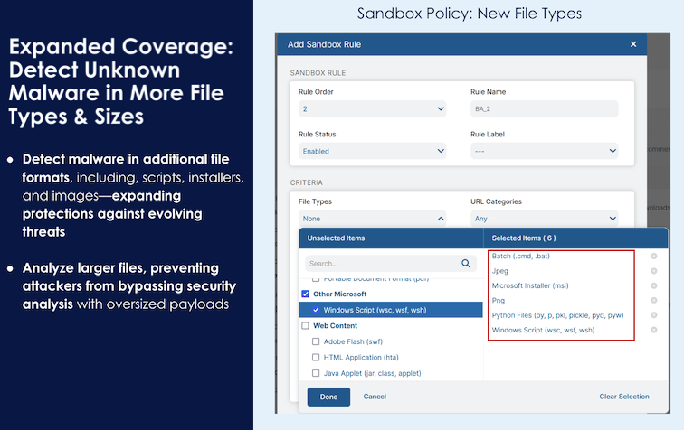 Threat actors constantly change their attack tactics and strategies, including how they use malicious files with uncommon or new file types. Attackers also attempt to use oversized files to bypass security tool analysis. Zscaler addresses this critical challenge by using advanced sandboxing technology to inspect and analyze scripts before they can be released to customer environments. ZIA’s Cloud Sandbox now supports additional file types in addition to larger files overall based on our signal telemetry from the Zscaler Zero Trust Exchange.