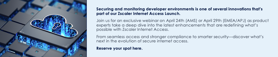 Securing your developer workflows at scale while enabling growth is one of several topics we’ll cover during our Zscaler Internet Access Innovations webinar on April 23, 2025. We’ll take a look at the latest ZIA enhancements and show you how they can break silos without compromising on security. RSVP now and take the first step toward secure, scalable developer ecosystems!