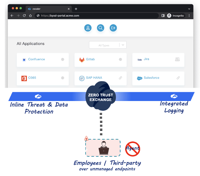 With Zscaler, end users authenticate into a portal for a dashboard view of their sanctioned SaaS and private web apps, without the need for an endpoint agent or forcing them to use anything but their favorite browser. This is because app access is provided through Zscaler Browser Isolation running under the hood, creating an isolated browser instance within an ephemeral cloud container that sends all traffic through the natively integrated policies and controls of the Zscaler Zero Trust Exchange. With this platform, users enjoy a managed device experience and security through whichever device they please.