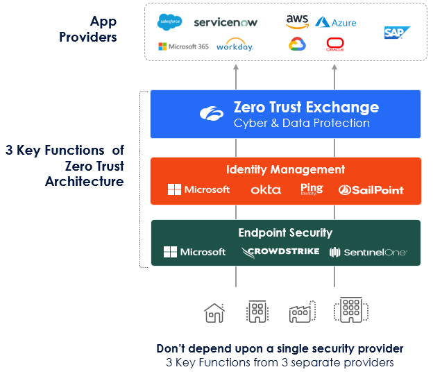 - Consolidate on best-of-breed and integrated leading platforms to maximize your availability of key services if one platform goes down. Specifically, we recommend not to put all your eggs in one basket when it comes to endpoint, identity, zero trust access and application providers (including hyperscalers).