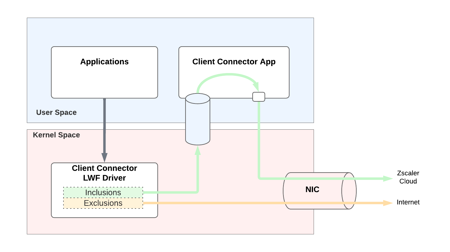 One of Client Connector’s primary functions is to intercept outbound traffic generated by local applications and redirect the IP packets through a ZIA tunnel or ZPA tunnel to the Zscaler cloud. In ZIA specifically, the drivers for traffic interception in Tunnel mode have to run in the kernel space (other interception methods such as Tunnel with Local Proxy do not require kernel drivers). In ‘ZIA Tunnel Mode - Route Based’, Client Connector runs a Virtual Network Adapter driver and in ‘ZIA Tunnel Mode - Packet-Filter Based,’ it runs a Windows lightweight filter driver (LWF) that forwards packets to a dedicated Client Connector process based on customer-defined filters.