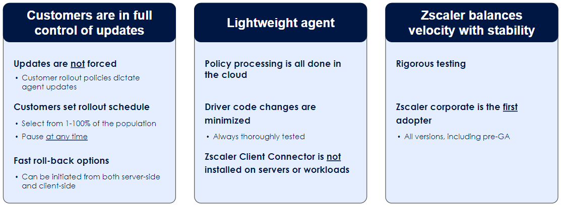 While no cloud vendor is immune to issues, Zscaler has multiple safeguards in place that dramatically lower the risk. While we have our own endpoint agent, its function and the types of updates we push to it are very different from endpoint security vendors: