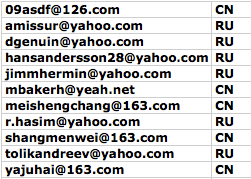 But the majority of the C&Cs were recently registered domains with registration information ranging from China to Russia to "private" registration. Below is a list of some of the email addresses used (by the criminals) to register the domains,