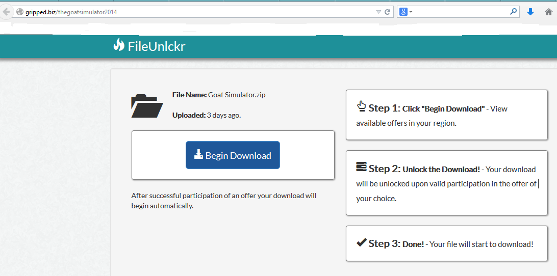 Sadly, neither download provides access to Goat Simulator 2014, but instead just continues to take advantage of the user's good faith by offering them free gift cards if they enter their e-mail address and Personal Identifiable Information.