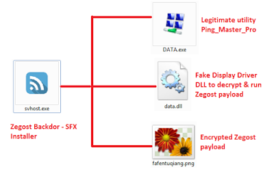 The Zegost payload was being delivered as part of an installer archive, which is similar in structure to the APT RAT PlugX and HttpBrowser as detailed here. The downloaded installer was svhost.exe, which has following file structure: