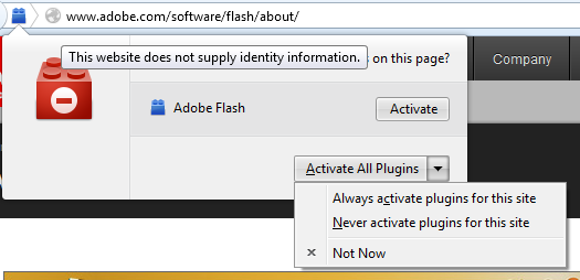One of the problems in the previous implementation of Click to Play was that plugins could be used without any visual widget on the page, so no warning would be displayed to the user. In Firefox 17, there is an additional icon on the left of the URL bar that is visible when a plugin has been disabled on the page. You can click on the blue icon to choose what to do: enable the plugin once, always enable the plugin on the site, etc.