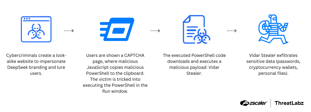 This blog post delves into a DeepSeek-themed malware campaign that abuses the popularity of the name. Alongside brand impersonation, this attack chain demonstrates techniques, including clipboard injection to deliver malicious PowerShell commands, the deployment of the Vidar information stealer, and the use of legitimate platforms like Telegram and Steam to conceal command-and-control (C2) communication. We also examine additional look-alike domains designed to lure users into interacting with malicious webpages.