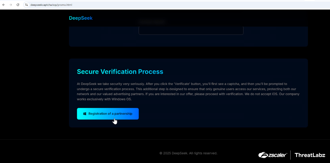 Figure 3: The DeepSeek-themed webpage prompting users to complete a fake partner registration.