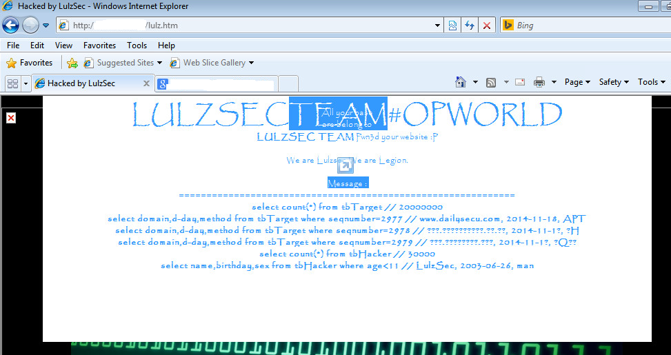 Defacing websites has been the main stay for hacktivist groups to spread their message.  During recent research, we found multiple compromised websites containing a malicious link to a "lulz.htm" page, which in turn leads the user to a Dokta Chef Exploit Kit (EK) hosting site. This appears to be  a new tactic whereby a hacktivist group has escalated their activities by attacking users who visit defaced sites.  This is out of character for such groups that generally seem more interested in disrupting private sector compliance with government entities, than targeting end users.