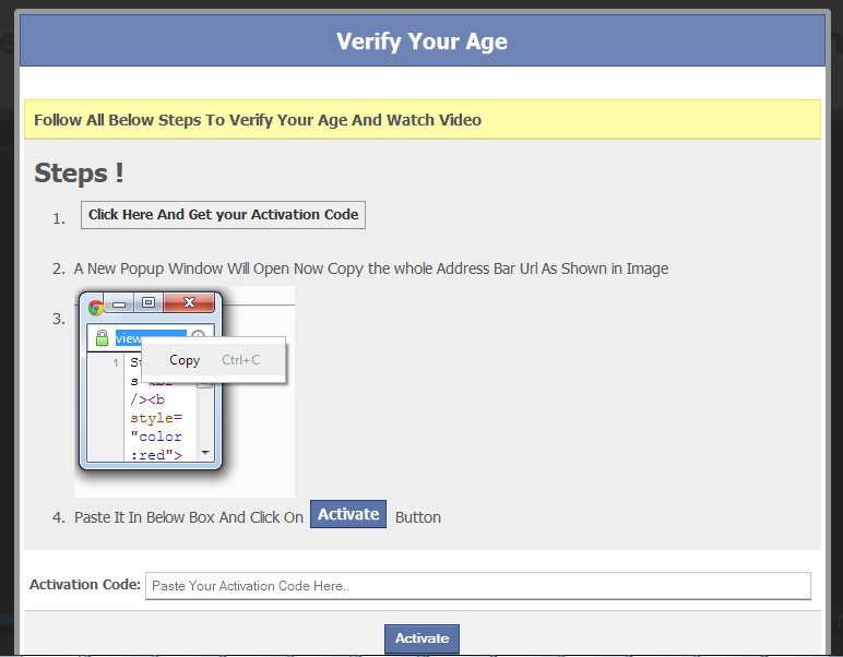 The user must click to verify his age, another common trick to get users to click on the page. This displays a list of steps to "verify your age" which involve clicking on another link, copying a link from the window opened, and submitting the data.