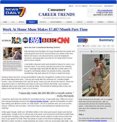 One of the recurring web spam themes I saw in 2011, was the "Work from home and make $X,000/month" scam. In some variations of the well-known and well-used scam, websites are set up to look like a well-established newspaper with a front-page (fake) article about making a lot of money from home.