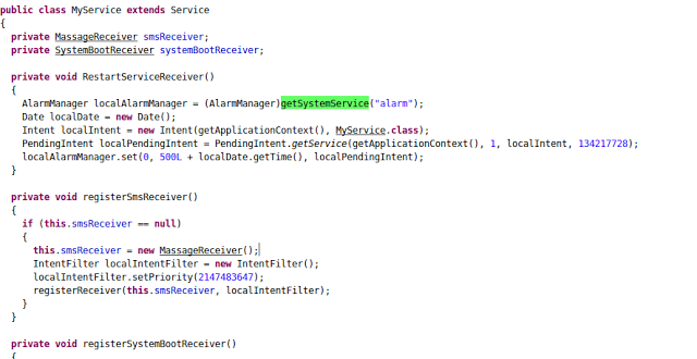 The malware also registers few broadcast receivers alongside. Broadcast receivers are Android components which acts upon activation of particular events they are registered for.