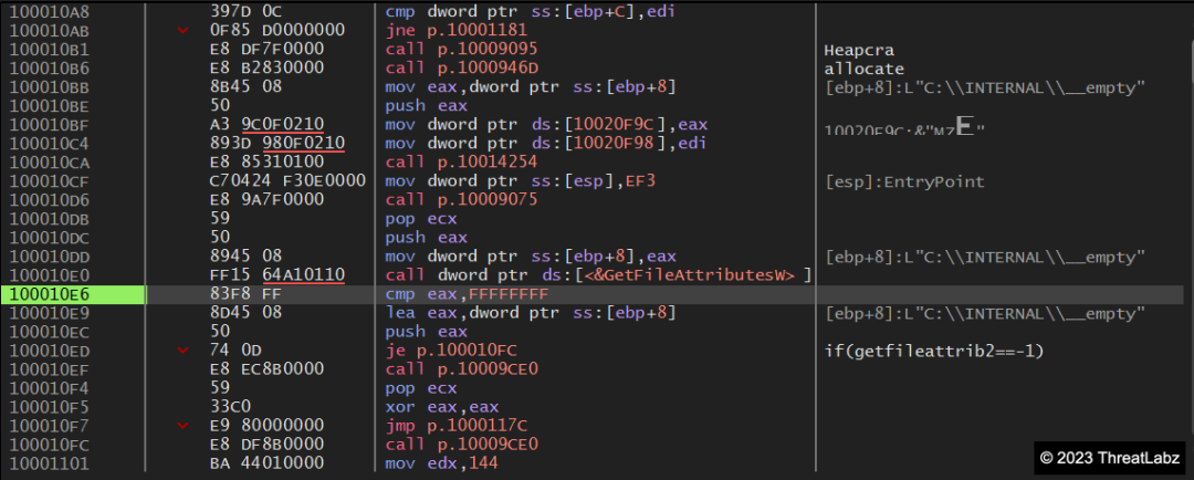 Following execution, the Qakbot malware checks if it is running under the Windows Defender Sandbox environment using the GetFileAttributeW() function. Specifically, it searches for the presence of any directory named "C:\INTERNAL\__empty," and if detected, Qakbot terminates itself. This behavior showcases the malware's efforts to evade analysis within sandboxed environments and highlights its sophistication.