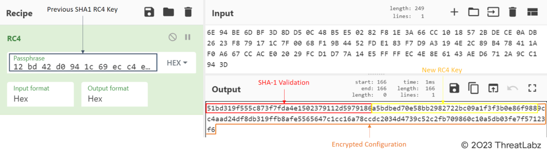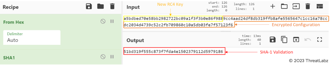 The SHA-1 validation of the New RC4 key and the Encrypted Configuration matches with the first 20 bytes obtained from the decrypted data in the previous step (Figure 17).