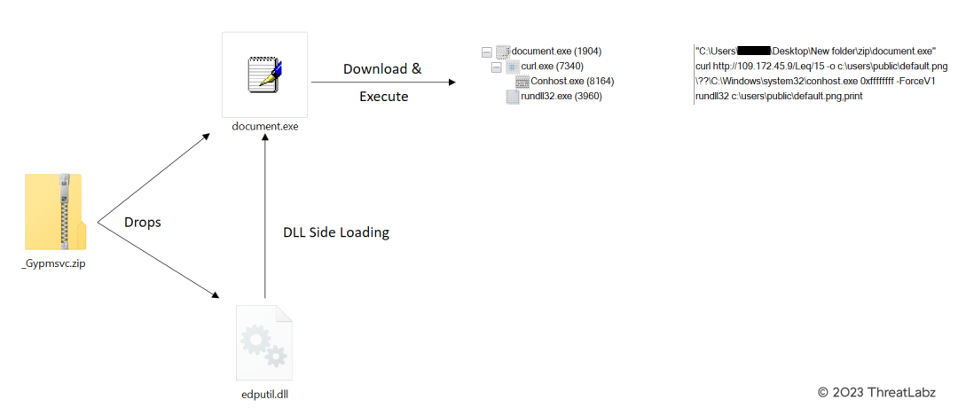 In this intricate attack chain, the initial vector is a ZIP file that conceals an executable (EXE) file. Upon execution, the EXE file loads a hidden dynamic-link library (DLL) that employs a curl command to download the final Qakbot payload. This attack chain also involves the use of DLL side loading technique, adding another layer of complexity to the attack.