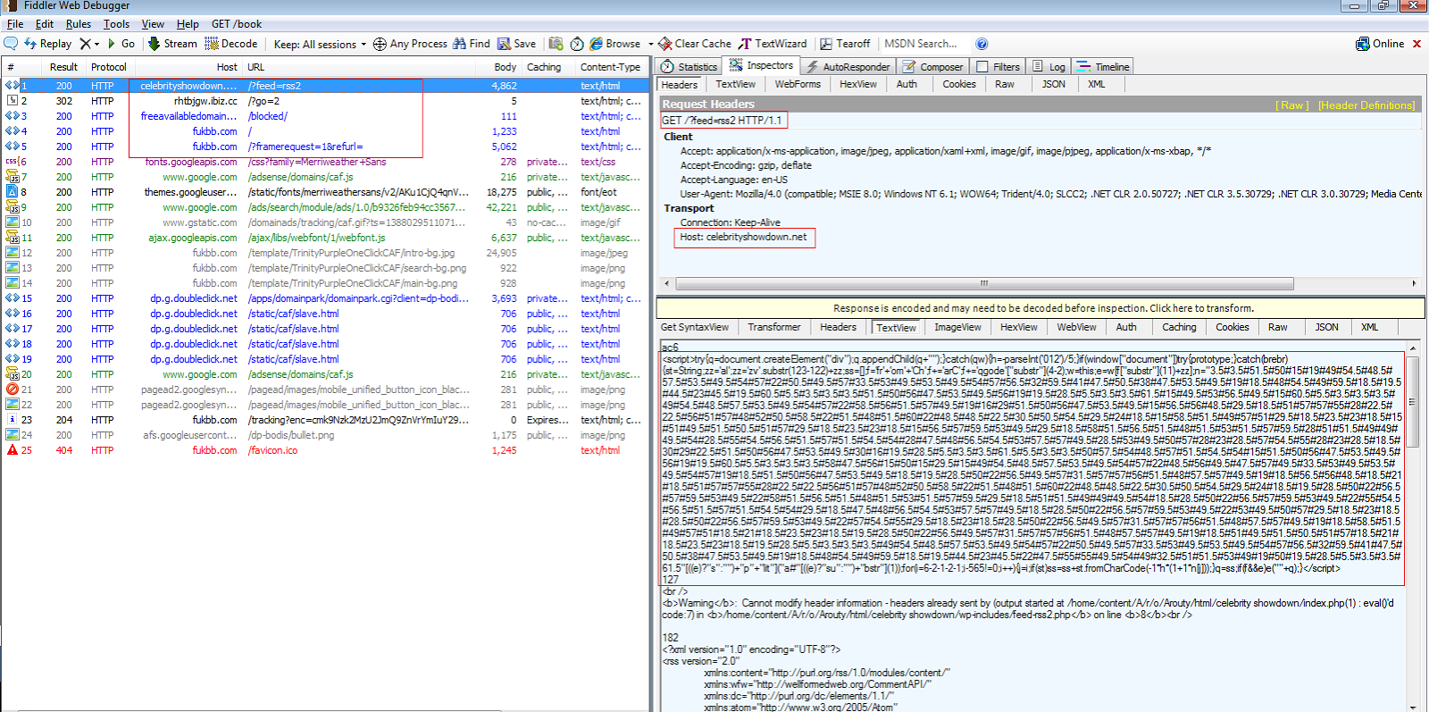 Similar instances of this infection have been found on ‘http://celebrityshowdown.net/?feed=rss2’, which is also an RSS feed management site. The following is the network trace seen when visiting this URL.