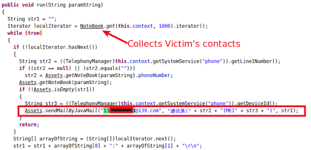 MailTask's main role is to collect contact information from the victim's device and send it to attacker via the same functionality explained in case of SmsTask.