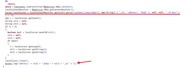 The main task performed by MyService is to collect all the SMS messages from inbox of the victim's device. Once that is done, it stores all the messages in its local logs.