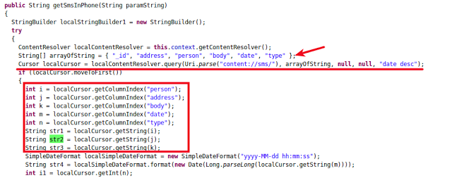 In one instance, malware was trying to fetch phone numbers received in SMS messages and then calling them, as shown in screenshot below: