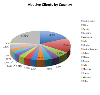 The top 15 countries account for over 75% of the abusive clients that we have seen- with the US, China, Russia, Germany, Venezuela, and India accounting for half of the abusive clients that we have seen to date.
