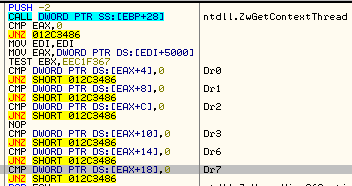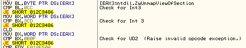 - Before making a call to some Windows APIs, it also checks for a breakpoint instruction in the API code.
