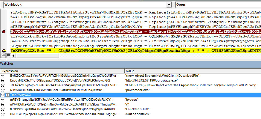 A few of the malicious attachments are XLSM files having obfuscated malicious macros with the function Sub Auto_Open(). When a victim opens the Excel file, a macro code will be automatically executed. Here also, similar to SCT files, a hardcoded URL is being used to download the initial payload and is executed via a PowerShell command.