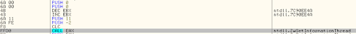 - It tries to detach from the attached debugger using the NtSetInformationThread Windows API and an undocumented thread information class - ThreadHideFromDebugger (0x11).