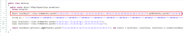 The applet is used to make a call to the malicious jar file which uses CVE-2013-2460, as shown here. The following screenshot, shows the JAR file exploiting the vulnerability. The JAR file then downloads and invokes the malicious executable. a recent VT report shows a poor detection ratio for the JAR file.