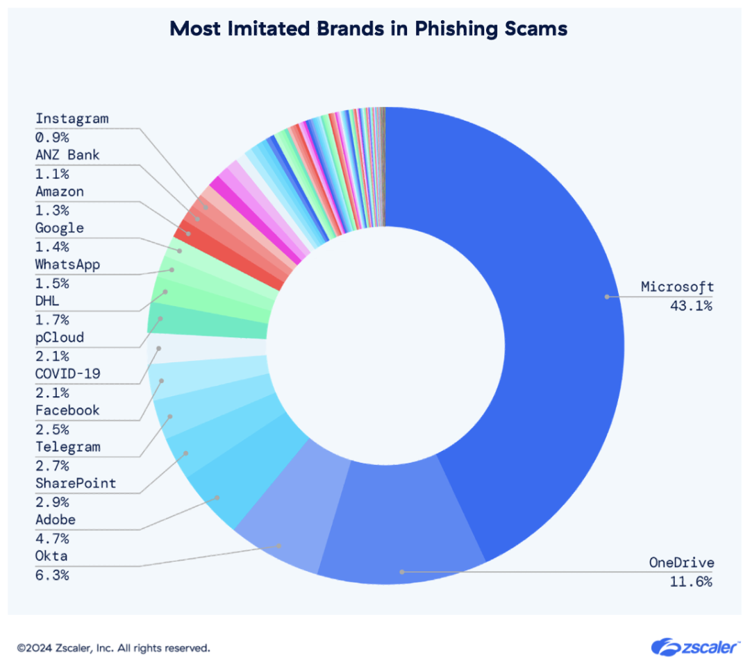- Microsoft remains the most frequently imitated brand, with 43.1% of phishing attempts targeting it.