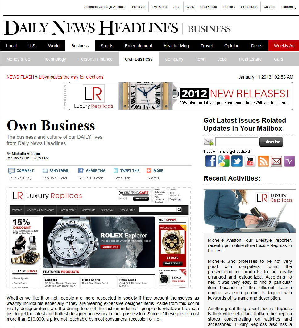 For the Joomla campaign, the final spam page is hxxp://www.dailynews.com.2012.fashion.italy.moda.trends.luxurynws.com/. As often is these type of scams, the page looks like an official news paper article extolling the merits of some product or work from home scheme. In this case, the products are replicas of luxurious watches.