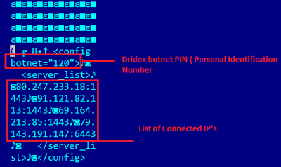 The current Dridex sample tries to connect to different IPs included in the config file. The config file for the sample is embedded in the sample itself. In the config file we observed a botnet ID and list of C&C servers. Below is a snapshot of config file: