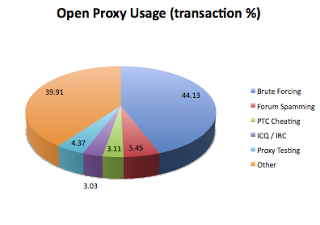 I've analyzed many thousands of transactions on a few "elite" open web proxies, to determine how they are being used (abused). This is the general breakdown of the percentage of the transactions that I analyzed (there were over a quarter of a million total that I reviewed).